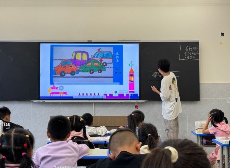 美术课堂上,李德麾老师以孩子们喜爱的动画视频进行导入,利用简单直观的教学手段,让孩子们轻松掌握排列法和遮挡法,更好地去描绘他们心中“繁忙的大街”。在学生创作时,李老师亲切地进行巡回指导,鼓励他们充分发挥自己的想象力和创造力,用色彩和线条绘出独特的城市街道印象。