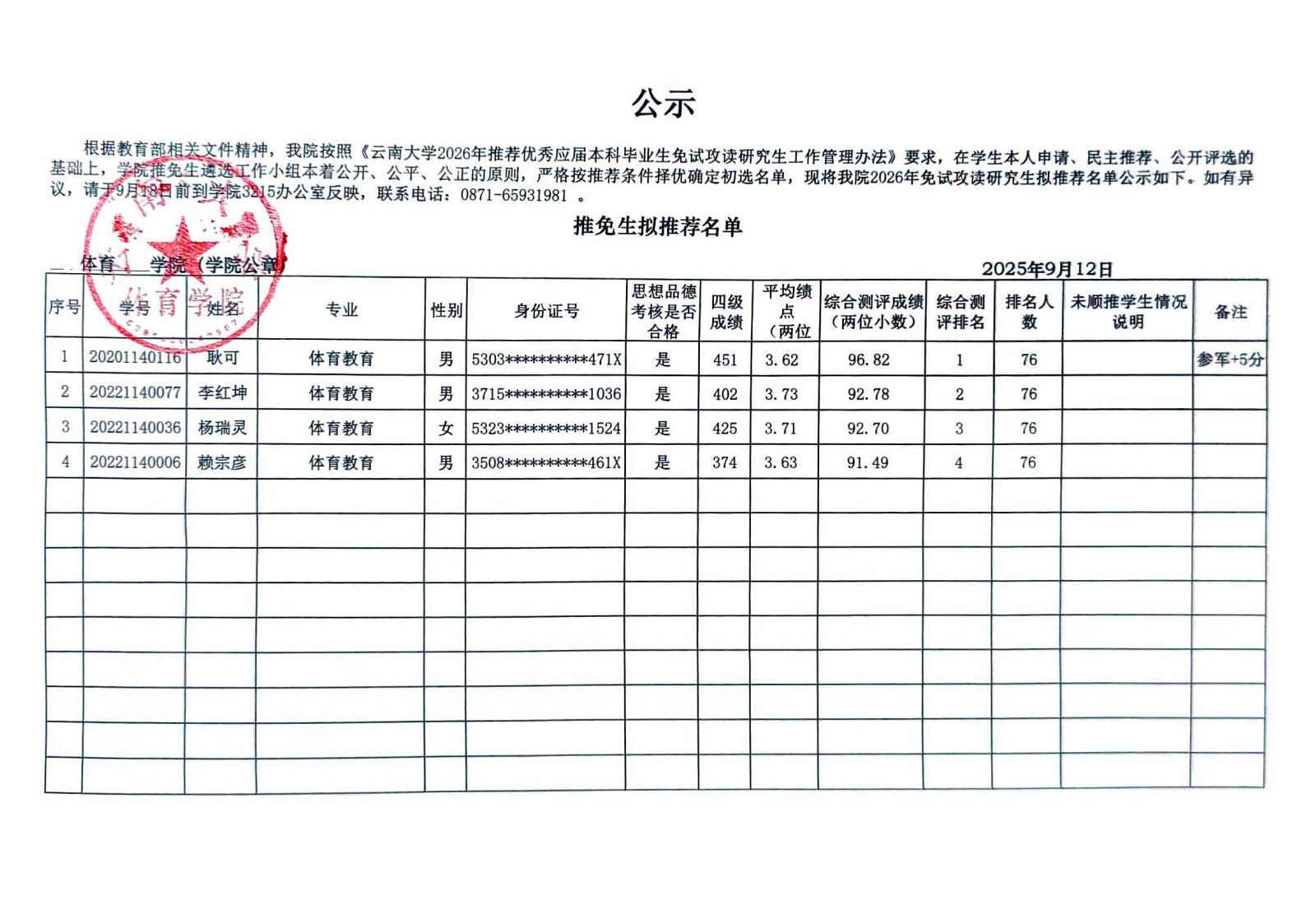 beat365在线唯一官网2026年推荐优秀应届本科毕业生免试攻读研究生名单公示