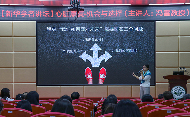 讲座伊始,冯雪播放了《回家》的短片视频,为在座的师生们分析和介绍了心脏康复事业的现状以及未来的发展。冯雪以“我们如何面对未来”为话题展开了今天讲座的内容,首先提到了医学事业的未来有无限可能,也会有无限的困难,并为同学们讲述未来的医学知识体系面临的机会和选择。