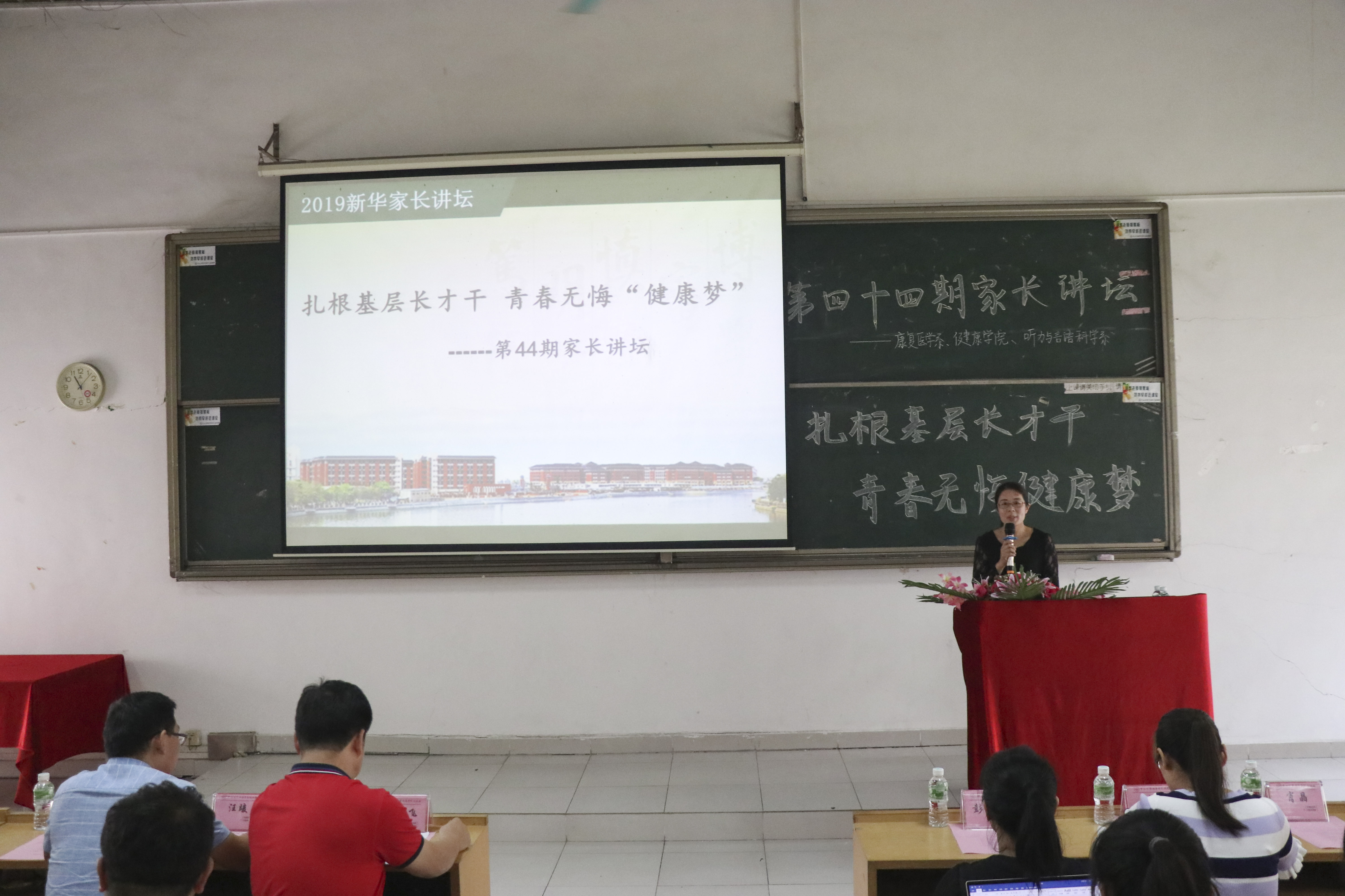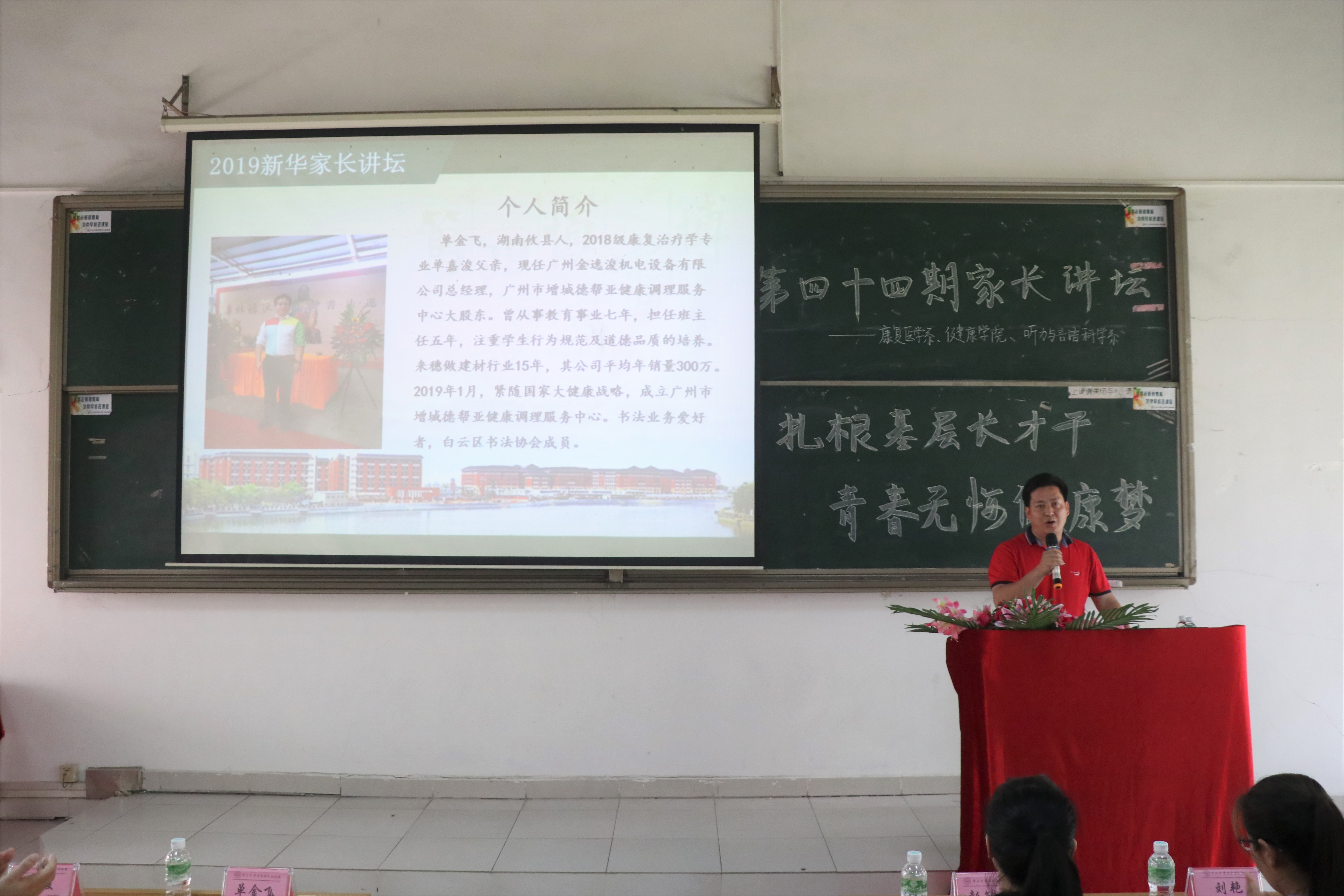 4月10日下午,中山大学新华学院(以下简称“kaiyun官网”)主办,kaiyun官网学生处、康复医学系、健康学院、听力语言与科学系(以下简称“三系”)承办的第四十四期家长讲坛在广州校区教学楼D103举行。本次讲坛特邀2018级康复治疗学专业陈安琪、单嘉浚两位学生的家长彭敏芳女士和单金飞先生来校主讲,康复医学系辅导员吴亚丽老师主持讲坛。kaiyun官网学生处副处长刘艳、医学科学技术学科党总支副书记肖晶、健康学院学生工作办公室主任汪竣、听力与言语科学系学生工作办公室副主任郑臻等教师代表及2018级三系学生代表参加讲坛。