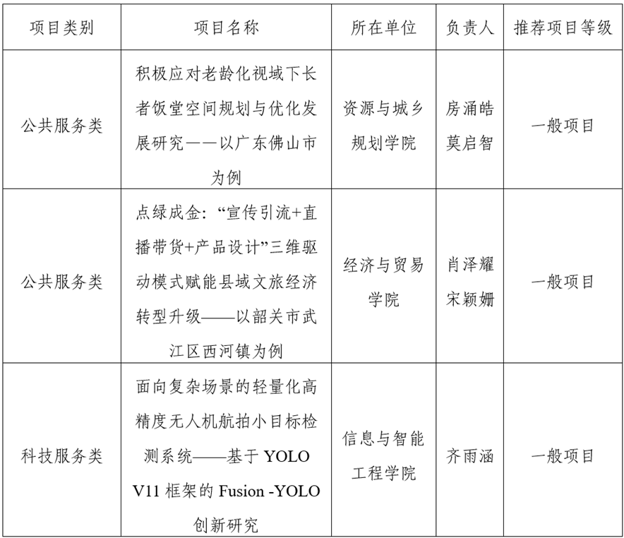 为深入学习贯彻党的二十届四中全会精神,明确中华人民共和国国民经济和社会发展第十五个五年规划纲要,积极响应新时代对高素质人才的迫切需求,进一步培育青年大学生的团队协作精神和科研创新思维,根据《关于开展2026年度广东省科技创新战略专项资金(大学生科技创新培育)项目申报的通知》的有关要求,校团委组织开展2026年广东省科技创新战略专项资金(大学生科技创新培育)项目申报工作,kaiyun官网推荐3个一般项目申报省级立项。前期,经团队项目申报、资格审查工作小组审查核实、项目答辩等环节,经综合评定,推选《积极应对老龄化视域下长者饭堂空间规划与优化发展研究》等3个项目为“一般项目”,推荐省级立项。现予以公示。