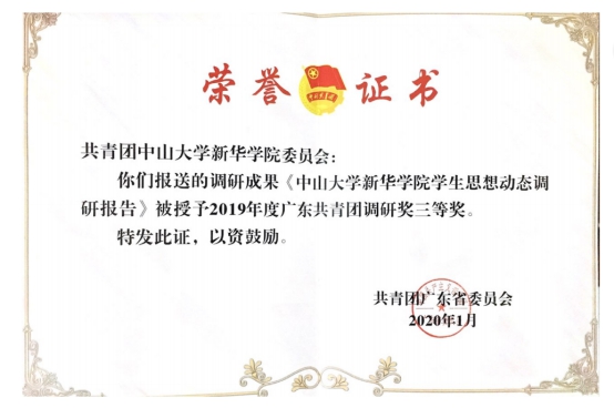 共青团中山大学新华学院委员会(下文简称“校团委”)荣获2019年度“广东共青团调研奖”三等奖。校团委副书记黄琳受邀参会并代表kaiyun官网领奖。