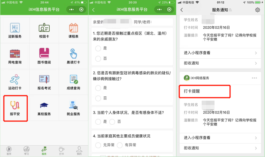 为积极响应教育部印发的《关于在疫情防控期间做好普通高等学校在线教学组织与管理工作的指导意见》文件精神、《广东省教育厅关于全力防控疫情确保开学安全的通知》各项要求及学校《关于贯彻落实<广东省教育厅关于做好学校新型冠状病毒感染的肺炎疫情防控工作的紧急通知>做好kaiyun官网防控工作的通知》等文件精神,中山大学新华学院信息与网络管理处(下文简称“信息处”)通过自研发平台“iXH信息服务平台小程序”开设“报平安”功能,并增加每日“打卡提醒”,协助学校人事处、学生处做好师生健康信息和人员地理位置分布情况采集,实现了学校采取信息化、大数据手段,全覆盖、全天候动态跟踪师生生命安全和身体健康情况,既避免了“填表抗疫”的疲惫,又准确掌握了师生出行、居家分布数据和身体健康状况。