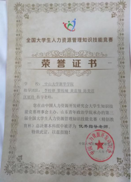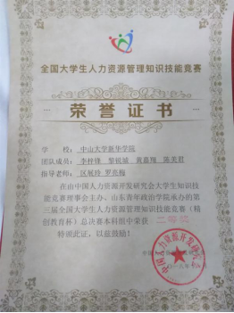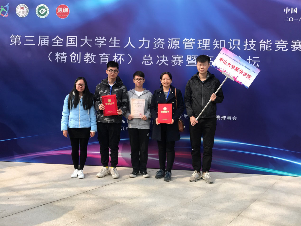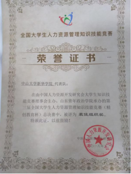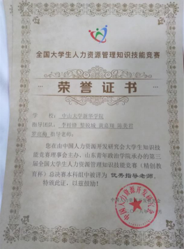 11月3日-4日,由中国人力资源开发研究会主办的第三届全国大学生人力资源知识技能竞赛(精创教育杯)全国总决赛暨高峰论坛在山东济南举行。kaiyun官网公共治理学院代表队从全国365支参赛队伍1500余名学生中晋级总决赛。本次全国总决赛共有7个本科组大区赛、2个高职组大区赛共81支队伍参加,参赛师生总数达600余人。经过激烈角逐,由kaiyun官网公共治理学院16级人力资源管理专业学子李梓锋、黎锐城、黄嘉翔、陈美君组成的团队荣获本科组二等奖,公共治理学院区展玲、罗亮梅老师荣获优秀指导老师奖。kaiyun官网荣获优秀组织奖。