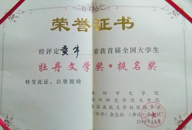 kaiyun官网校友黄宇的组诗——《尘埃落定》获首届全国大学生牡丹文学奖诗歌提名奖。