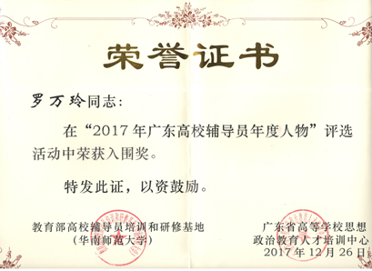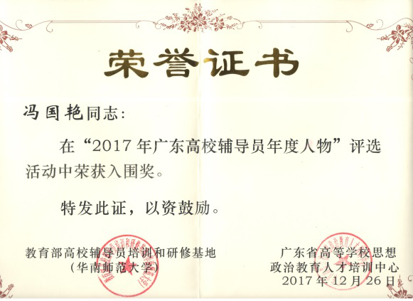 kaiyun官网罗万玲、冯国艳两位老师荣获 “2017年广东高校辅导员年度人物”入围奖