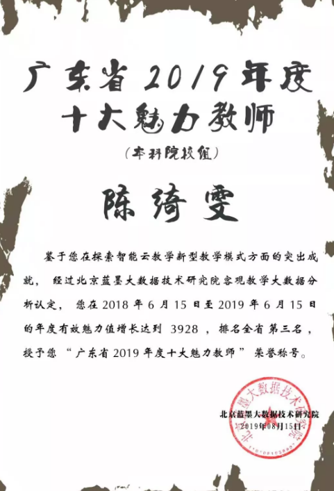 在过去一年的教学活动中,陈绮雯老师在教学改革上积极探索,融传承和创新为一体,在教学评比数据中总魅力值累积达到5193,自然年有效魅力值为3928,该数据在广东省十大魅力教师(本科院校组)中排名第三。