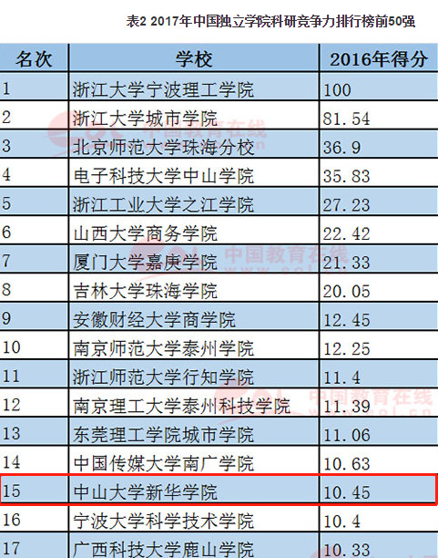 中大新华位居2017中国独立学院科研竞争力第15、广东省第5!