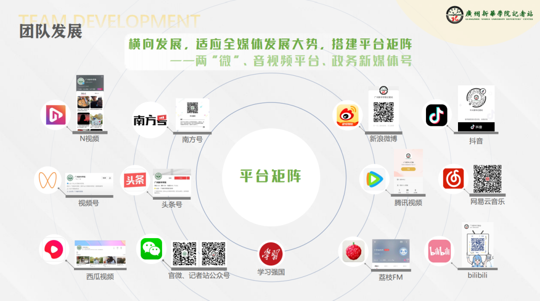 广州新华记者站努力打造成为一支可视化融媒团队,通过微博、微信公众号、抖音、B站、头条号、N视频等新媒体渠道传播校园资讯、讲述校园故事,形成新媒体传播矩阵,利用多元媒体传播形式增强校园新闻的传播力、影响力。团队顺应融媒体的发展趋势,打造出多个融媒体微品牌,在微信公众号上推出了多篇视频与采访相结合的优秀推文。