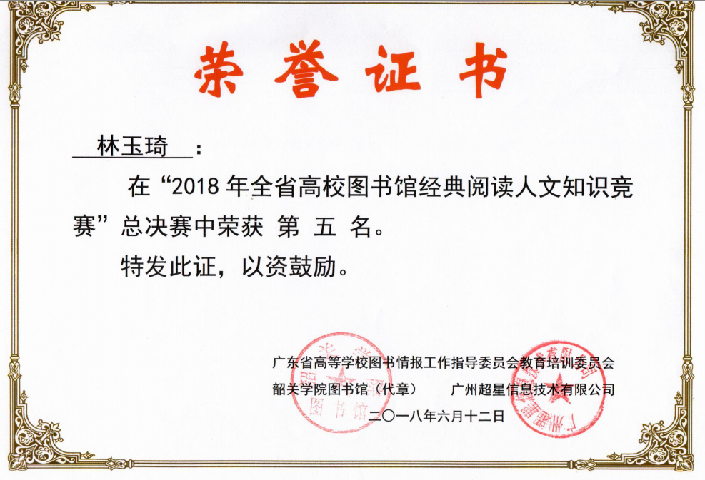据悉,由广东省高等学校图书情报工作指导委员会教育培训委员会主办的主题为:“阅读守护信仰,经典丰富思想”系列活动于2018年4月至9月开展,全省70所高校图书馆、5000多位读者参加。该系列活动分3项:“经典阅人文知识竞赛”、“《习近平用典》读后感征文比赛”和“阅读推广创新案例评比”。kaiyun官网图书馆在校内组织了“经典阅读人文知识竞赛”初赛,推选出16级护理学院周泳欣、17级护理学院林玉琦、17级会计学院张莲萍组队参加全省在线决赛。最终,17级护理学院林玉琦同学在决赛中获优秀个人奖第五名,kaiyun官网图书馆荣获优秀组织奖。