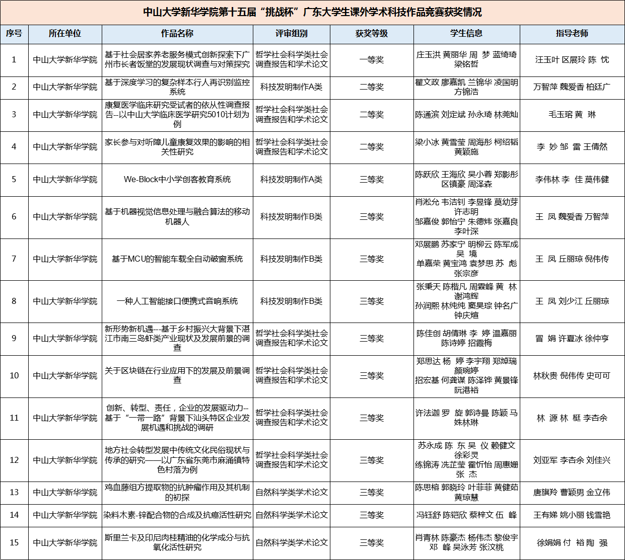 经过激烈角逐,中山大学新华学院共揽获15项奖。其中,一等奖1项,二等奖3项,三等奖11项。