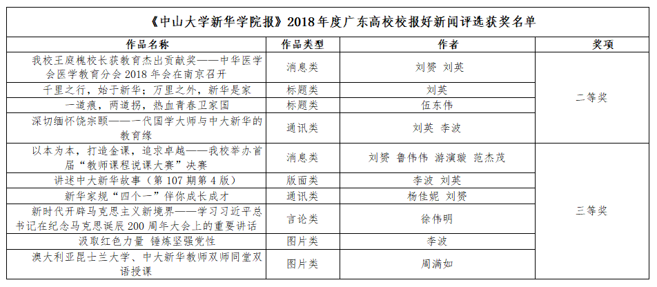 《中山大学新华学院报》2018年度广东高校校报好新闻评选获奖名单