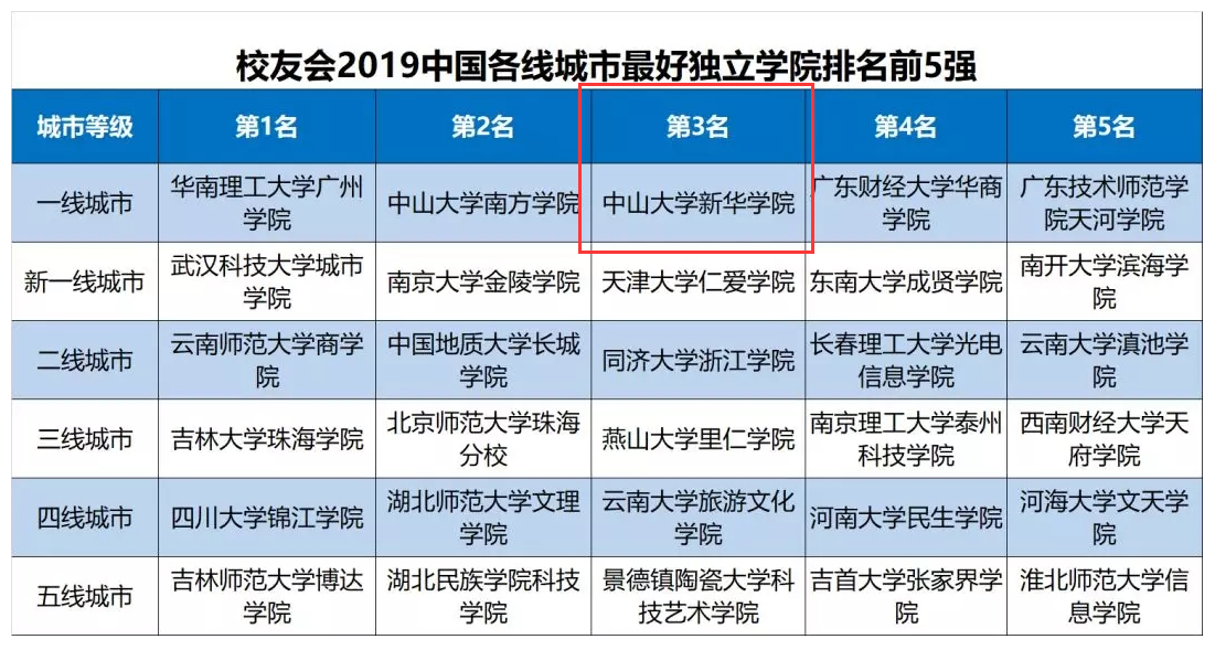 4月15日,由艾瑞深中国校友会网编撰完成、科学出版社公开出版发行的《2019中国大学评价研究报告》最新发布2019中国各线城市最好大学排名。中山大学新华学院位居“2019中国一线城市最好独立学院排行榜”第三名。