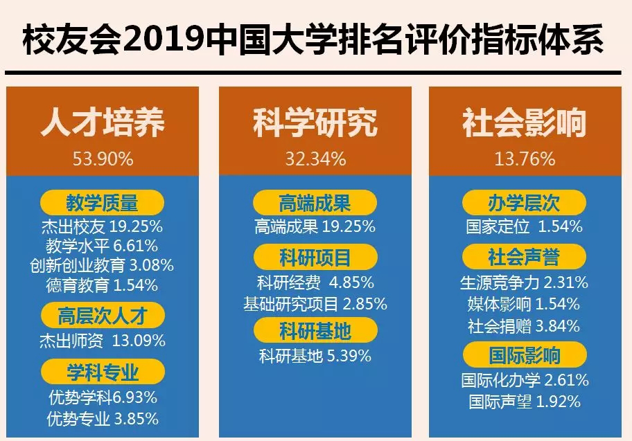 据悉,校友会中国大学排名是目前中国最具影响力、权威性和公信力的大学排行榜之一,是与国家“双一流”建设方案及遴选标准、教育部学科评估体系吻合度最高的第三方大学评价领先品牌,至今已连续17年发布中国大学排名。校友会2019中国大学排行榜评价体系采用了教育教学质量、高层次人才、学科专业、高端科研成果、科研项目、科研基地、办学层次、社会声誉和国际影响等9大核心指标,涵盖人才培养、科学研究、社会服务和文化传承等核心职能的300多项4级评价指标,是目前中国大学评价指标数量最多、最为系统全面的大学排名体系,基本覆盖国内外其他中国大学排名的高端质量指标。