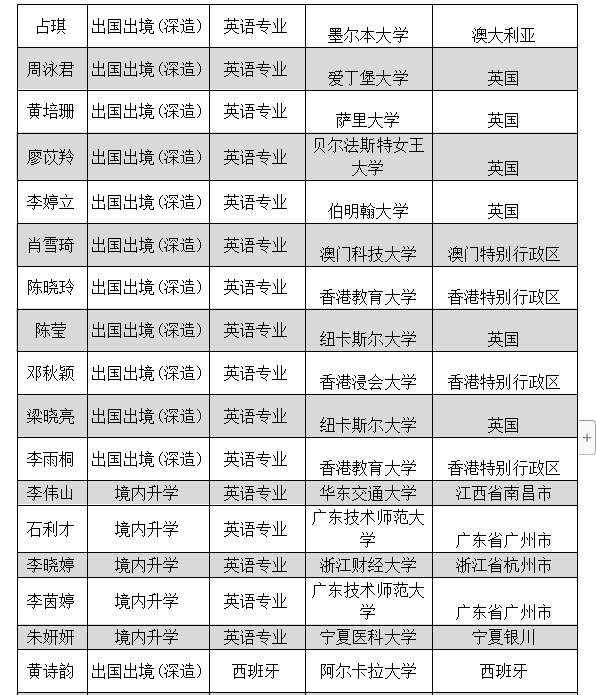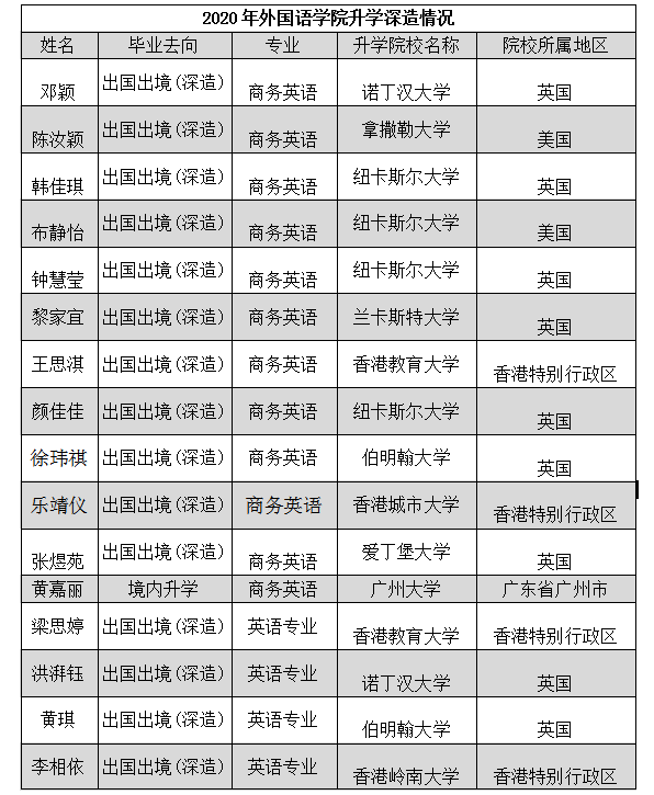 近日,中山大学新华学院外国语学院(下文简称“外国语学院”)2020年被录取为硕士研究生的人数再创新高。2020届毕业生中共有36名同学被诺丁汉大学、拿撒勒大学、纽卡斯尔大学、香港教育大学、伯明翰大学、爱丁堡大学、广州大学、华东交通大学、广东技术师范大学等国内外知名学府录取,继续深造。