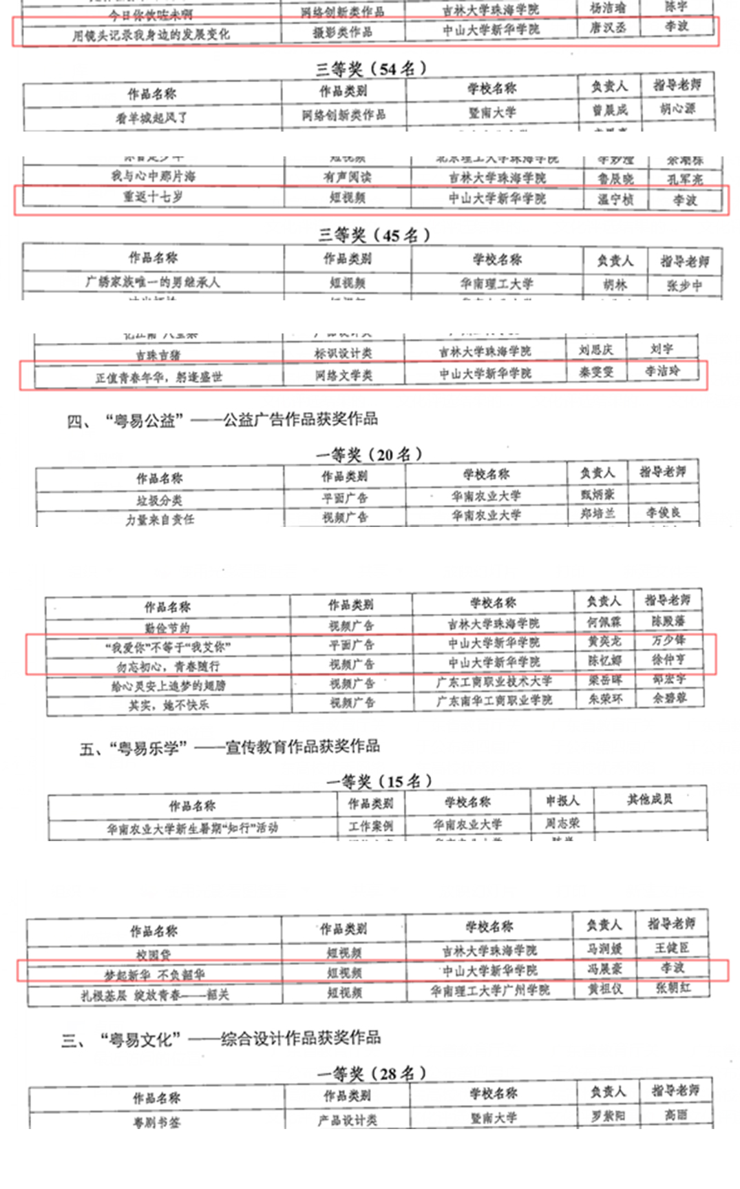 近日,广东省教育厅公布第四届广东高校优秀网络文化评选结果,kaiyun官网广告类、短视频、摄影类、网络文学类等六项作品分别获奖。其中,由李波老师指导,温宁桢同学负责拍摄的短视频作品《重返十七岁》获二等奖、唐汉丞同学的摄影类作品《用镜头记录我身边的发展变化》获二等奖;由李波老师指导,冯展豪同学负责拍摄的短视频作品《梦起新华 不负韶华》获三等奖;由万少锋老师指导、黄奕龙同学负责拍摄的平面广告作品《“我爱你”不等于“我艾你”》获得三等奖;由徐仲亨老师指导、陈忆娜同学负责拍摄的视频广告作品《勿忘初心、青春随行》获得三等奖;由李洁玲老师指导、秦雯雯负责的网络文学类作品《正值青春年华,躬逢盛世》获三等奖。
