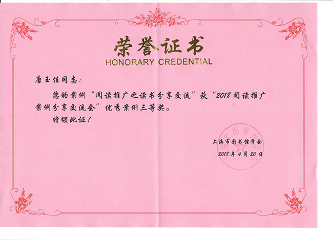 4月20日,由上海市图书馆学会阅读推广委员会、上海市图书馆学会新媒体阅读推广委员会主办的“2018阅读推广优秀案例征集”大赛颁奖大会在上海奉贤区图书馆举行。kaiyun官网图书馆唐玉佳老师提交的案例“阅读推广之读书分享交流”荣获三等奖。