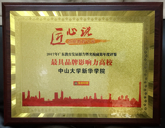 近日,2017年广东教育发展报告暨名校成果年度评鉴结果揭晓,中山大学新华学院(以下简称学校)荣获“最具品牌影响力高校”的荣誉称号。