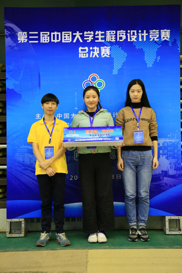 2017年第三届中国大学生程序设计竞赛(英文名称为China Collegiate Programming Contest,简称CCPC)已于12月3日落下帷幕,信科院张锦邦、黄佳旭、曾惠婧、黄晓纯组成的竞赛团队参赛。该项比赛遵循国际大学生程序设计竞赛(ACM-ICPC)赛制,分为网络赛、国赛和总决赛三个流程,全国各大高校都组成本校最强程序设计队伍参赛。