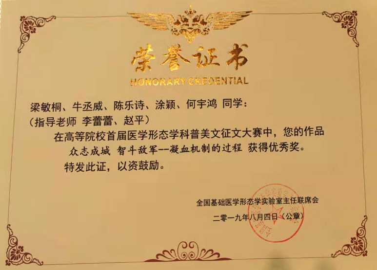 高等院校首届医学形态学科普美文征文大赛优秀奖奖状