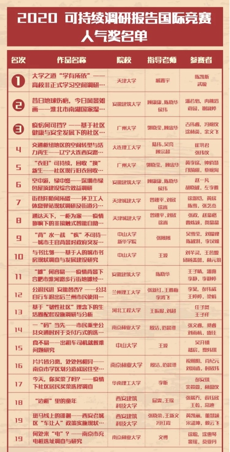 据了解,2020可持续调研报告国际竞赛面向全球所有设置城市规划与城市设计相关专业的高等院校发布,以促进国际城乡规划及相关专业高等教育和师生间的交流。该项赛事的前身是全国高等学校城乡规划专业指导委员会举办的学生作业评优,2020年升级为世界规划教育组织(WUPEN)举办的国际竞赛,目前是国内城乡规划专业级别最高、最权威的竞赛之一。本次大赛共有来自同济大学、清华大学、北京大学等国内知名高校在内的近百所高等院校学子参加角逐。
