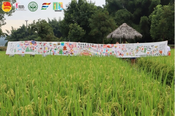 在稻田中展示与孩子们共绘的十米长卷