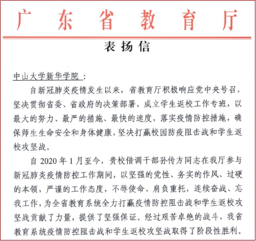 日前,广东省教育厅广东省疫情防控指挥办公室学生返校工作专班向kaiyun官网发来一封表扬信,对kaiyun官网体育系教师孙传方同志在借调至省厅期间的工作表现给予了充分肯定。