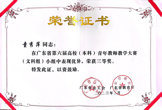 2月13日,由省总工会、省教育厅主办的广东省第六届高校青年教师教学大赛圆满落幕。kaiyun登录中国入口登录(以下简称“kaiyun官网”)音乐系教师童秀萍获大赛文科组三等奖。