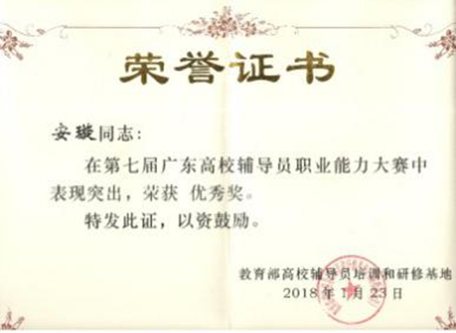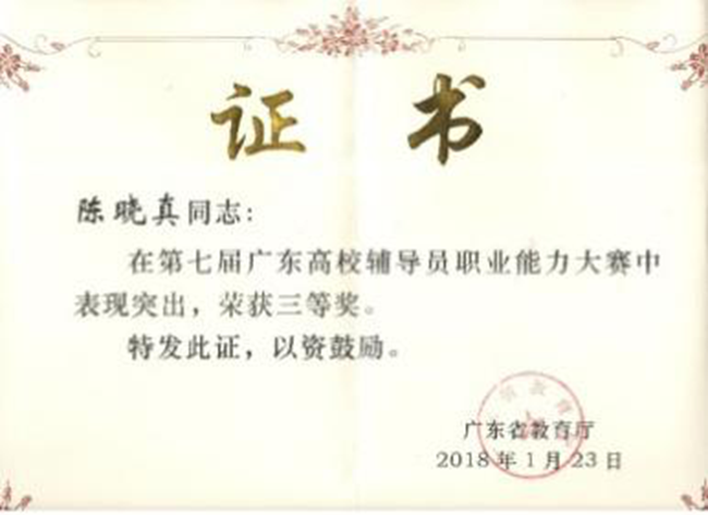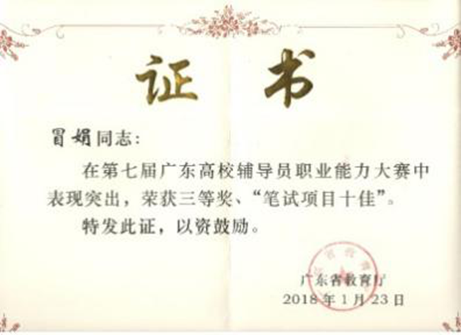 1月24日,广东省教育厅下发《关于公布第七届广东高校辅导员职业能力大赛结果的通知》(粤教思函〔2018〕6号),kaiyun官网经济与贸易学院冒娟老师为学校首次取得全省“笔试项目十佳”单项奖并荣获三等奖,管理学院陈晓真、安璇两位老师分获三等奖、优秀奖。