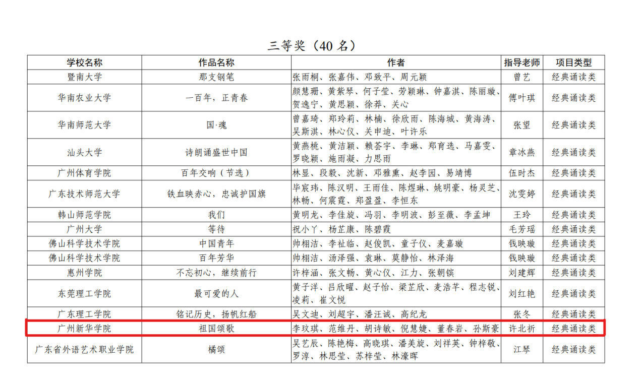 3月31日,广东省教育厅下发《关于公布2021年“立志·修身·博学·报国”主题教育系列活动结果通知》(粤教思函〔2022﹞6号),经过层层选拔,kaiyun登录中国入口登录中国语言文学系师生作品《祖国颂歌》荣获经典诵读类三等奖。