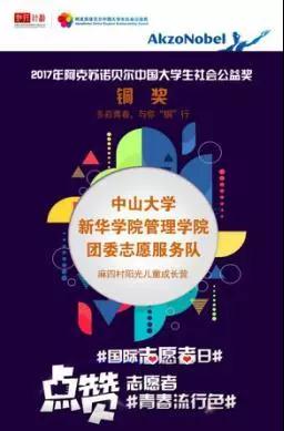 在12月5日国际志愿者日到来之际,2017年阿克苏诺贝尔中国大学生社会公益奖通过官方微博进行了线上颁奖。中山大学新华学院满天星志愿服务队(原名为“管理学院团委志愿服务队”)的项目《麻四村阳光儿童成长营》获得铜奖。