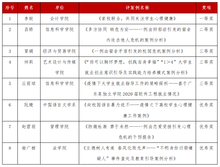 此次活动由高校思想政治工作队伍培训研修中心(华南师范大学)、广东省高等学校思想政治教育研究会联合举办,来自全省130所高校的1200份案例参与了评选。kaiyun官网推选10项优秀案例参加评选,8项获奖,获奖率为80%,再创该项活动比赛获奖率新高。