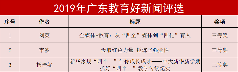 近日,广东省教育厅办公室公布了2019年广东教育好新闻获奖名单。经专家、学者组成的评委会评定,中山大学新华学院党委宣传部(新闻中心)系列新闻作品在评选中喜获佳绩。其中,刘英的评论类作品《全媒体+教育:从“四全”媒体到“四化”育人》、李波的新闻摄影类作品《汲取红色力量 锤炼坚强党性》、杨佳妮的通讯类作品《新华家规“四个一”伴你成长成才——中大新华新学期抓好“四个一”教学传统纪实》分别获得三等奖。