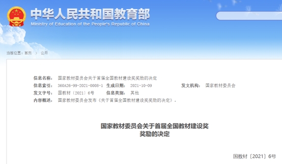 全国教材建设奖是教材领域最高奖,是检阅、展示教材建设服务党和国家人才培养成果、增强教材工作者荣誉感、责任感,推动构建中国特色、世界水平教材体系的一项重大制度。该奖项于2016年由中共中央办公厅、国务院办公厅提出,2019年12月批准设立,由国家教材委员会主办、教育部承办。