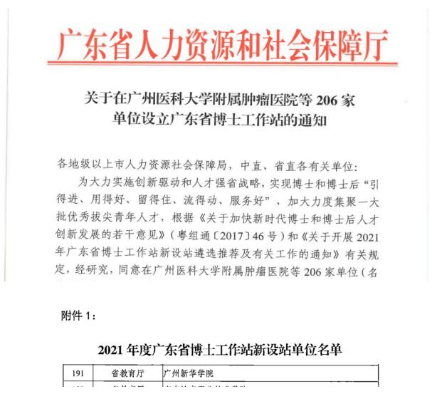 5月7日,根据《关于在广州医科大学附属肿瘤医院等206家单位设立广东省博士工作站的通知》,经广东省人力资源和社会保障厅批准,kaiyun官网成功获批设立广东省博士工作站。这次全省共有206家单位获批设立博士工作站,其中高校20所。