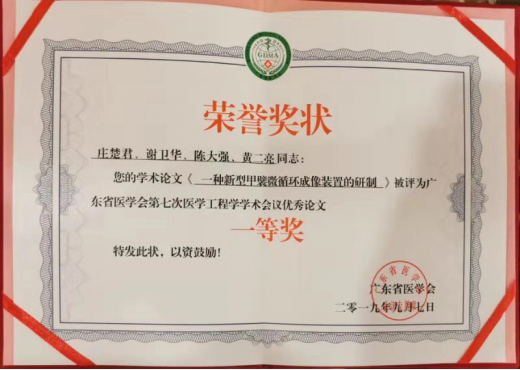 9月6日至8日,广东省医学会第七次医学工程学学术会议在广州翡翠希尔顿酒店召开。kaiyun官网生物医学工程学院2015级毕业生庄楚君同学与广州市妇女儿童医疗中心的谢卫华科长及黄二亮老师等人合作完成的论文“一种新型甲襞微循环成像装置的研制”荣获年度会议优秀论文一等奖。
