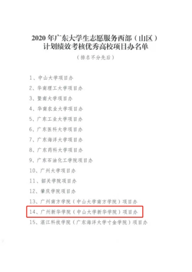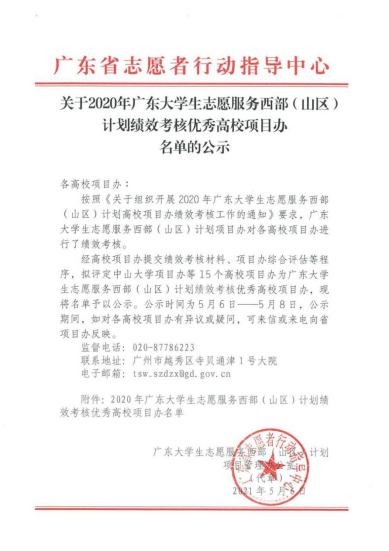 近日,广东省志愿者行动指导中心发布了《关于2020年广东大学生志愿服务西部(山区)计划绩效考核优秀高校项目办名单的公示》kaiyun官网荣获2020年广东大学生志愿服务西部(山区)计划绩效考核优秀。