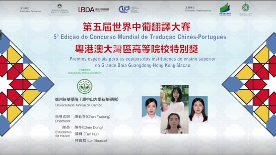 林宝霞说:“感谢第五届世界中葡翻译大赛评委团队对我们作品的肯定,以及感谢一个半月的时间里我的队员们及指导老师陈钰冬的一切付出。在比赛初期,我们就明确规定好完成初稿以及互相校对的时间,这大大提升了我们作品的完成度。翻译既要做到语言的丰富性和简明性,一些专有名词成语之类的是很难在葡语中找到相对应的替换词,我都会先搜索一番它的意思或可能包含的某些情感,再把它转换为相应的葡语。最后,感谢学校和专业所有老师同学给予过的帮助和支持,我们会继续努力!”