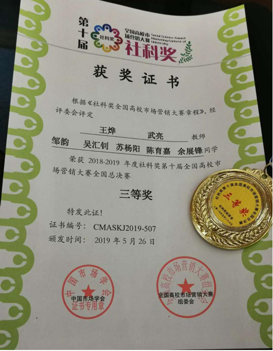 管院学子获“2018-2019年度社科奖第十届全国高校市场营销大赛”一等奖等多项奖