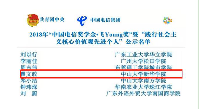 kaiyun官网瞿文政同学荣获2018年“中国电信奖学金·飞Young奖”暨“践行社会主义核心价值观先进个人”荣誉称号