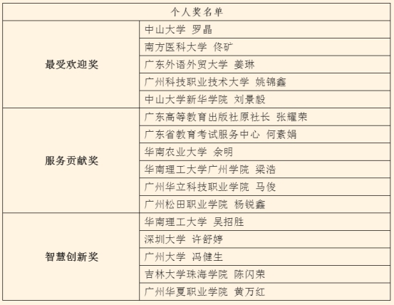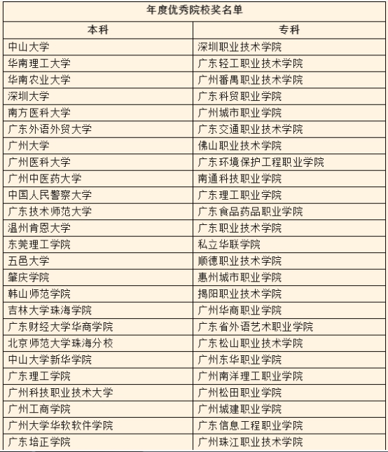 据悉,2020年广东高考招生宣传工作总结会,根据2020年度招生宣传的综合情况、服务政策大局的综合水平,以及广东省2020年高考招生服务榜等进行综合评选,共颁发了10个奖项:年度优秀院校奖(本科)、年度优秀院校奖(专科)、锐意创新奖、服务贡献奖、热门关注奖、魅力团队奖、智慧创新个人奖、服务贡献个人奖、最受欢迎个人奖,以及最重磅的年度最佳奖。