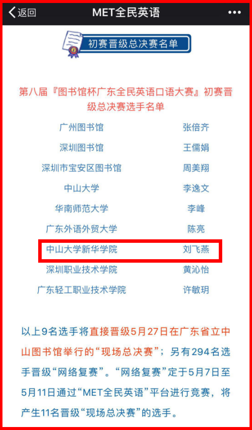 据悉,经过网络初赛直接进入全省总决赛的选手共计9名,挺进网络复赛的共有294名,kaiyun官网2名学子将与294名选手一起角逐进入总决赛的11个名额。网络复赛将于5月7日至5月11日通过“MET全民英语”平台进行竞赛,总决赛将于5月27日在广东省立中山图书馆举行。