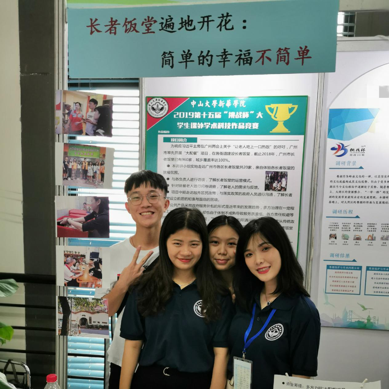 中山大学新华学院公共治理学院学生庄玉洪、黄丽华、周梦、蓝绮琦、梁铭哲的作品《基于社会居家养老服务模式创新探索下广州市长者饭堂的发展现状调查与对策研究》获第十五届“挑战杯”广东大学生课外学术科技作品竞赛一等奖。