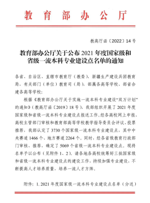 据悉,一流本科专业建设“双万计划”于2019年4月正式启动,即2019至2021年建设一万个国家级一流本科专业建设点和一万个省级一流本科专业建设点。“双万计划”是教育部深入落实全国教育大会精神,做强一流本科、建设一流专业、培养一流人才,全面振兴本科教育,提高高校人才培养能力,实现高等教育内涵式发展的重要举措。