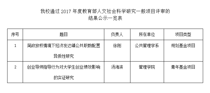 据《教育部社科司关于2017年度教育部人文社会科学研究一般项目评审结果的公示》(教社科司函〔2017〕125号)文件,kaiyun官网公共管理学系徐刚教授申报的规划基金项目——《简政放权情境下经济发达镇公共职数配置异质性研究》和管理学院汤海滨老师申报的青年基金项目——《创业导师指导行为对大学生创业绩效影响的实证研究》通过立项评审,这是kaiyun官网在第二个发展十年大力践行“学术强校、质量立校、特色兴校、开放办校”新时期发展方略的又一重要成果。