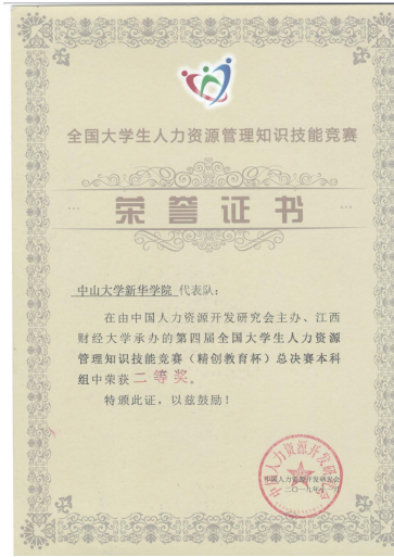 中大新华代表队获第四届全国大学生人力资源管理知识技能竞赛(精创教育杯)总决赛本科组二等奖