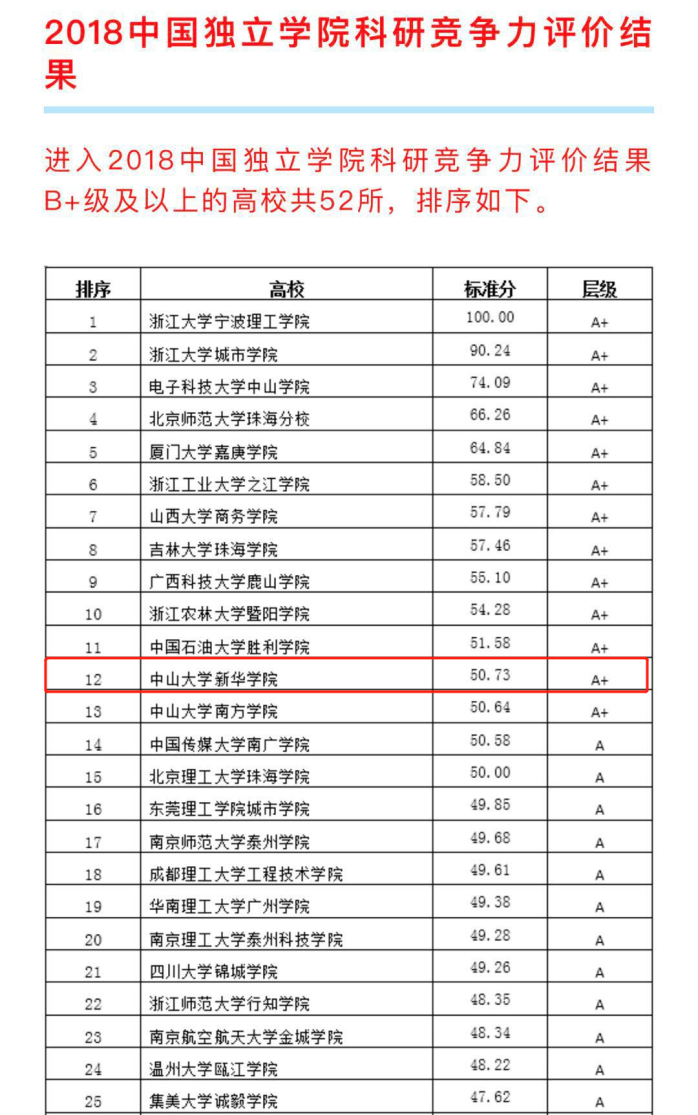 中大新华科研竞争力居2018全国独立学院第12、广东第4!