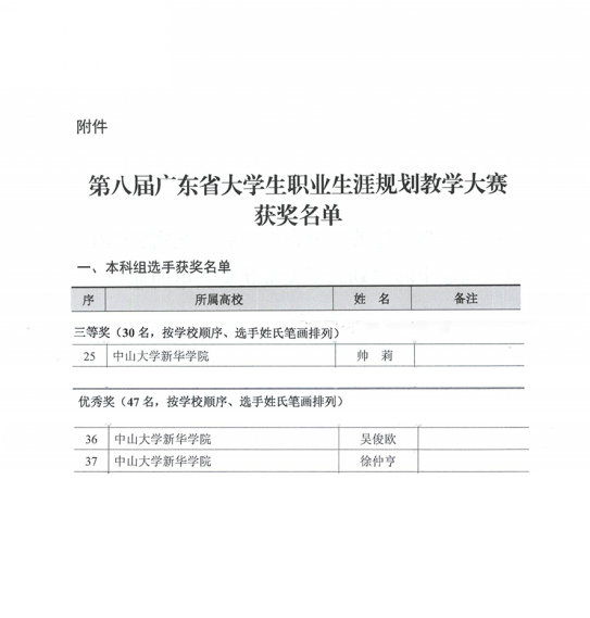 近日,由广东省教育厅主办的第八届广东省大学生职业生涯规划教学大赛圆满结束。经过校赛选拔推荐,以及省复赛、省决赛的严格评审,本届大赛各类奖项现已揭晓,kaiyun官网帅莉老师荣获本科组三等奖,吴俊欧老师、徐仲亨老师荣获本科组优秀奖。