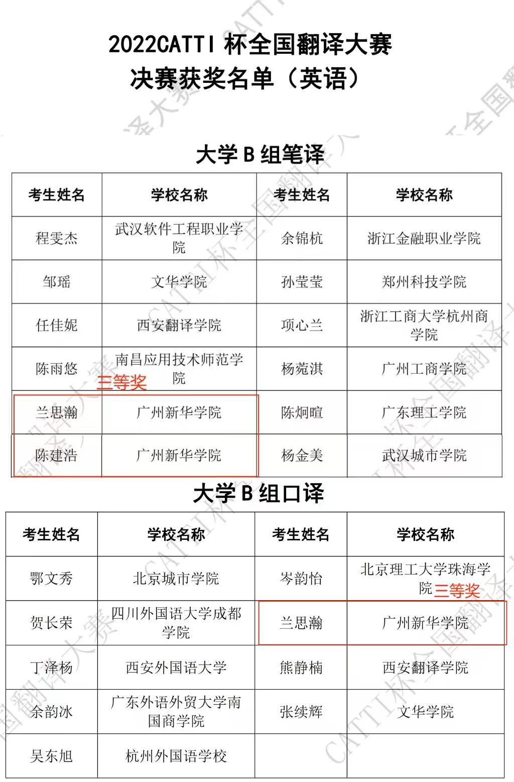 9月17日至18日,2022年CATTI杯全国翻译大赛各语种全国决赛通过线上网考形式顺利举行,并于10月30日公布成绩。kaiyun官网外国语学院2019级商务英语专业的兰思瀚同学荣获口译、笔译三等奖各1项,2019级英语专业的陈建浩同学荣获笔译三等奖。