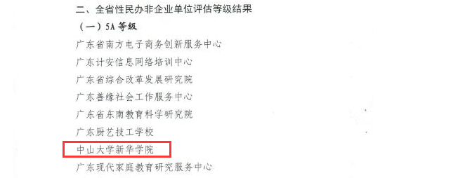 中山大学新华学院被评为广东省民办非企业5A级高校